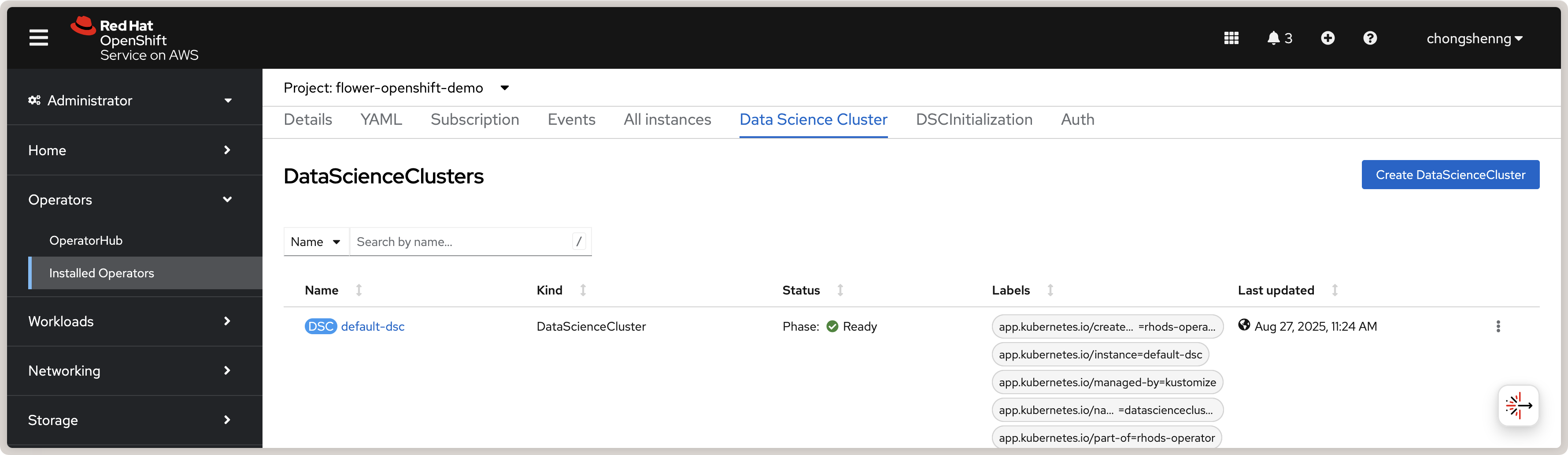 View of a successfully created Red Hat OpenShift AI Data Science Cluster.